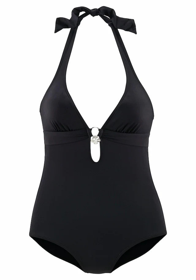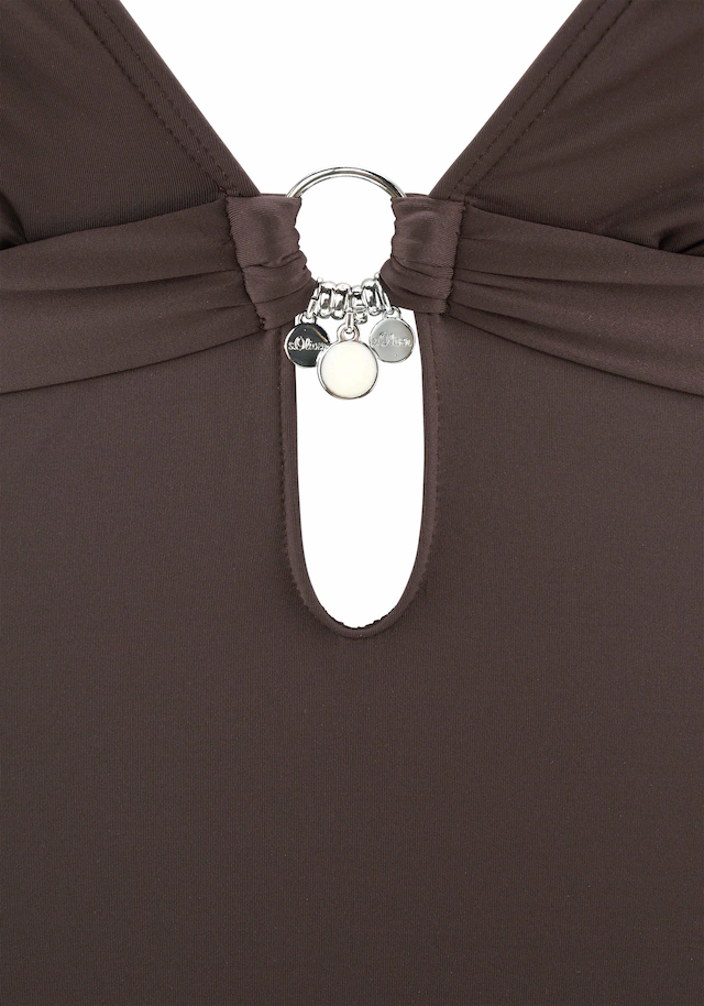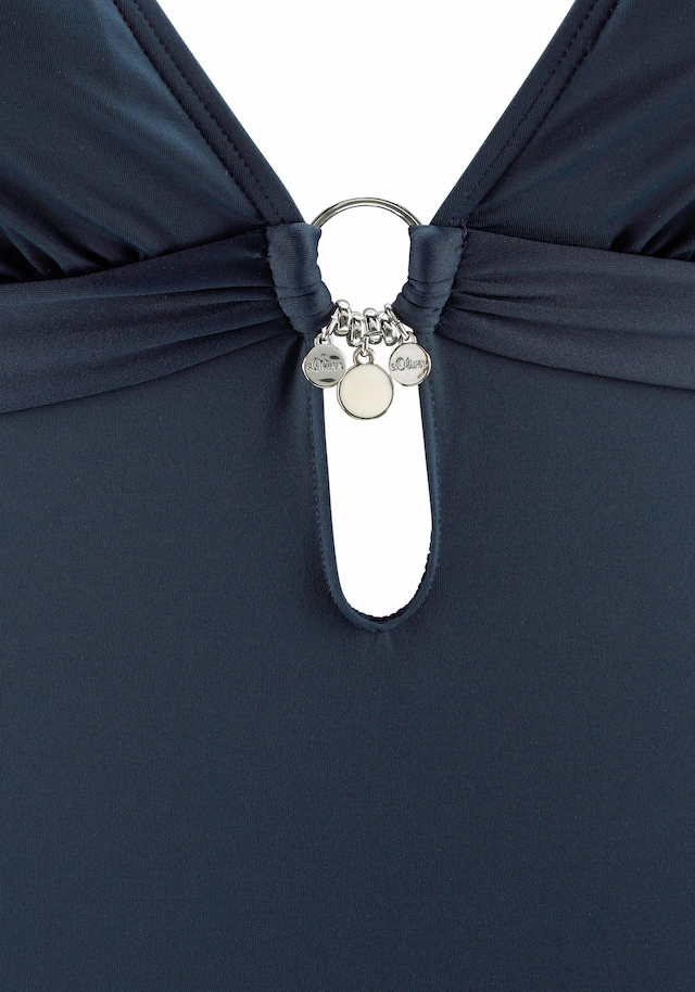 Bademoden von s.Oliver RED LABEL Beachwear mit silberfarbenen Accessoires als besonderes Trend-Detail. Badeanzug mit Accessoires zwischen den Cups, darunter mit raffinierter Öffnung. Herausnehmbare Cups, im Nacken zu binden und im Rücken zu schließen. Vorn gefüttert. Softe Microfaser.