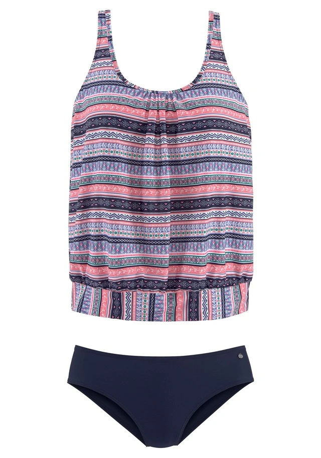 Tankini von s.Oliver RED LABEL Beachwear mit wunderschönem Bordürendruck. Top in aktueller, figurfreundlicher Oversize-Form: etwas weiterer Schnitt mit anliegendem Bündchen. Eingearbeitete Softcups, bis D-Cup geeignet. Unterbrustgummi rundum und Miedereinsatz im Cupbereich und oberem Rücken. Verstellbare Träger.