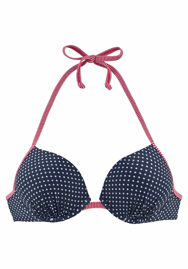 Im modischen Mix mit Punkte- und Streifenprints. Wattierte Cups mit eingearbeiteter Verstärkung für ein tolles Dekolleté. Im Nacken zu binden und im Rücken zu schließen.