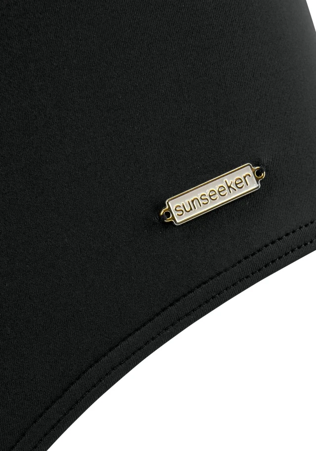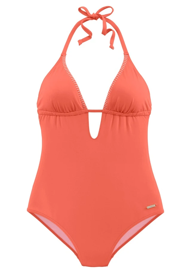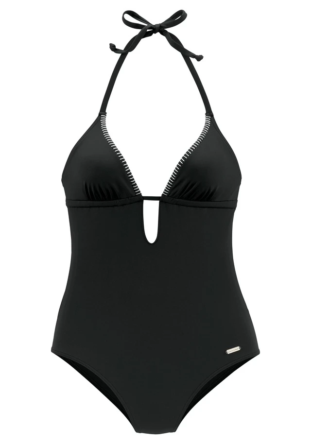 Badeanzug von Sunseeker. Unifarbenes Design mit farblich abgesetzter Häkelkante. Raffiniertes Dekolleté mit tiefem V-Ausschnitt. Tiefer Rückenausschnitt mit Trägern zum Binden. Herausnehmbare Softcups. Modisch geschnitten. Softe Microfaser.