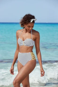 Nachhaltige, recycelte Microfaser aus: Obermaterial: 83% Polyamid, 17% Elasthan. Futter: 100% Polyester. Wattierung: 100% Polyester. Colles Streifendesign mit unifarbenen Kontrastdetails. Wattierte Cups mit herausnehmbaren Kissen für Cup A und B. Abnehmbare Träger im Nacken zu binden. Seitliche Stäbchen.
