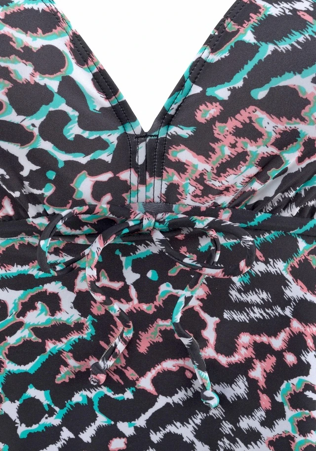 Im tollen Look in Schwarz kombiniert mit bunten Leodruck. In bauchbedeckender Form. Unter der Brust Regulierbar. Verstellbare Träger. Hose etwas höher geschnitten.