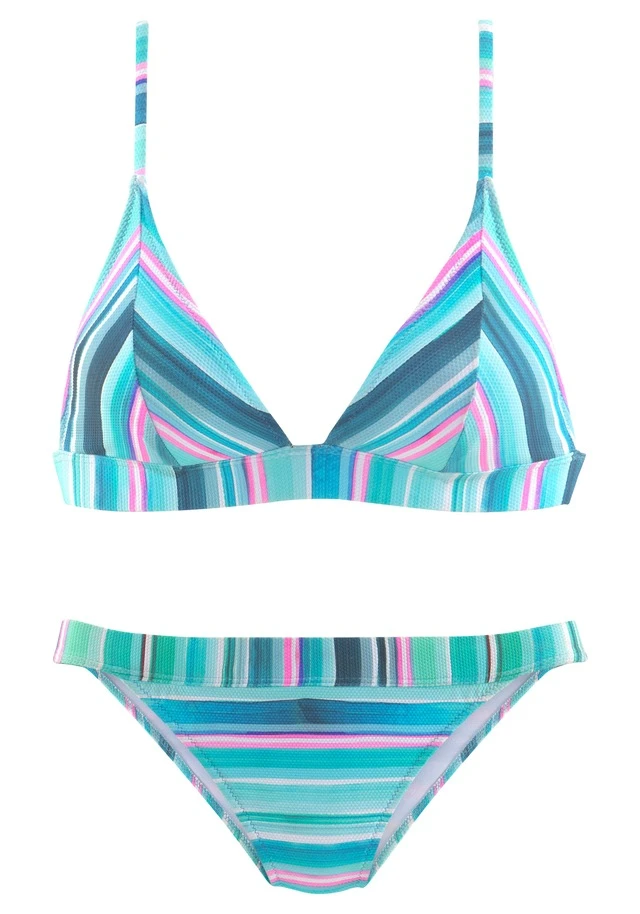 Triangel-Bikini von Venice Beach. Streifendesign in sommerlichem Farbenspiel. Verstellbare Träger können in drei Varianten getragen werden. Im Rücken mit Verschluss. Herausnehmbare Softcups. Klassisch geschnittene Bikinihose mit angesetztem Bund. Angenehme Strukturqualität.
