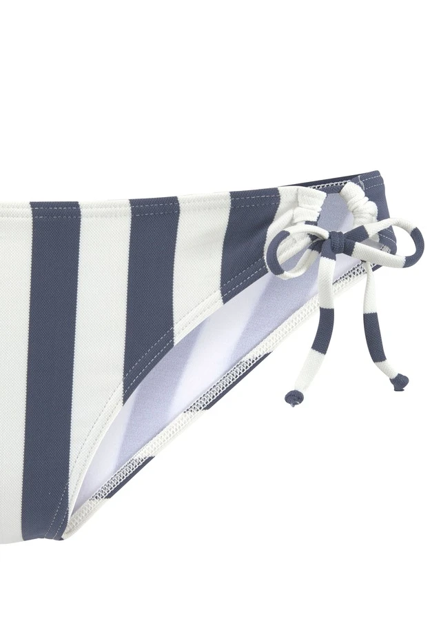 Maritim anmutender Triangelbikini von Venice Beach im Streifenmuster. Herausnehmbare Softcups. Top im Nacken zu binden und im Rücken zu schließen. Hose mit seitlichen Bindebändern. Perfekt zum Sonnen und Baden. Gefütterter Materialmix.