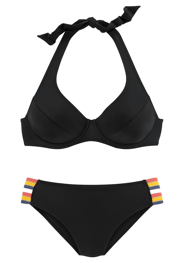 Unifarbener Bügel-Bikini von Vivance. Top mit Neckholder zum Binden und Verschluss im Rücken. Seitenstege mit bunt gestreiften Gummibändern. Etwas höher geschnittener Badeslip. Weiche Microfaser.